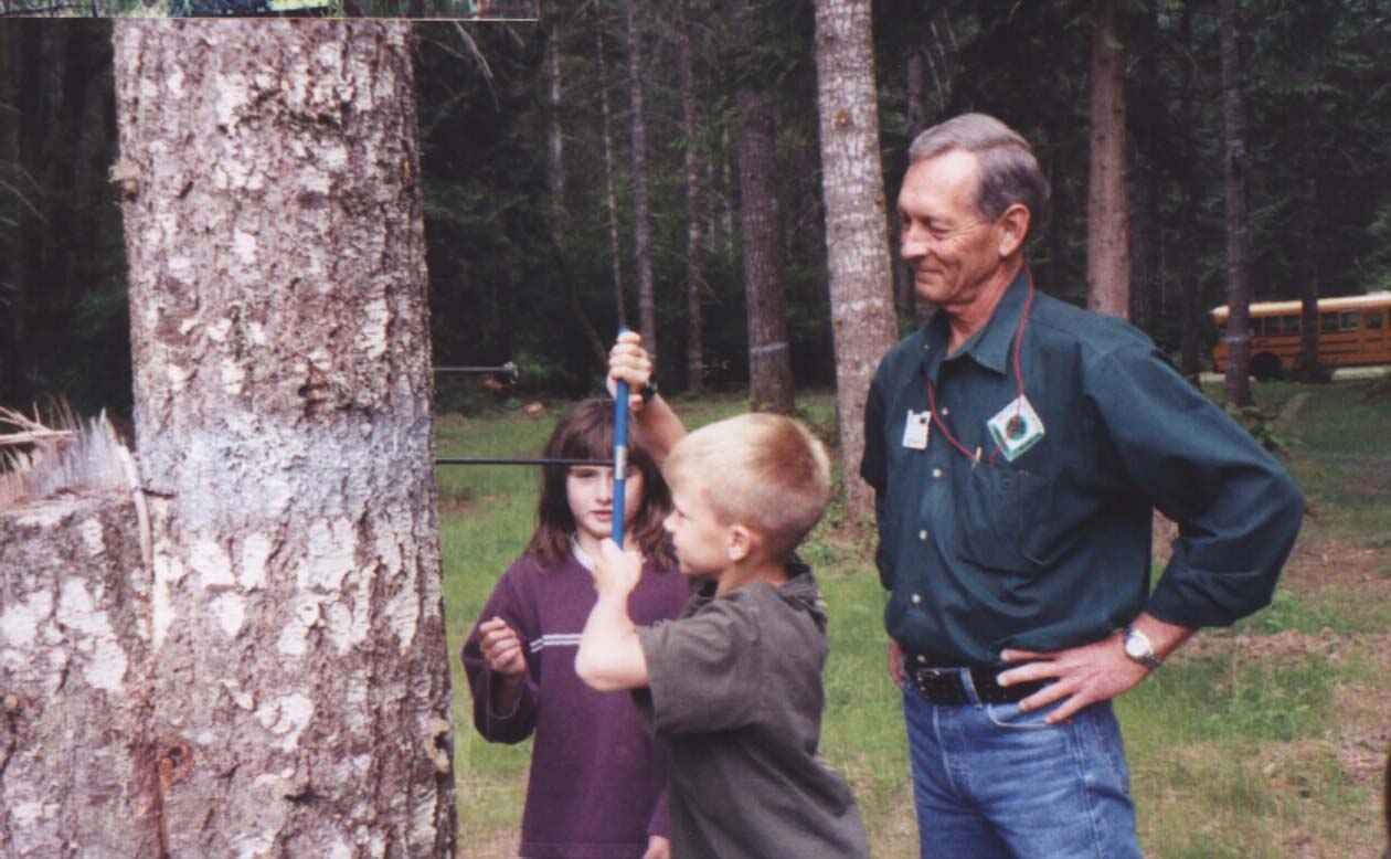 Creating a forest laboratory... Richard and Anne enjoy the forest. They like to share their enjoyment with others through guided forestry tours. They wanted to present a working tree farm to visitors as well as creating an educational opportunity. Over the past several years on the home place, Gales Creek, Richard and Anne have been in the process of creating an outdoor forest laboratory with easy access trails to historical and forestry management sites. Anne has fashioned a logger, Woodsy, who has become the official greeter and a hit with the youngsters. On a recent field trip, a group of students decided that the unnamed tributary to little Beaver Creek should be called "Woodsy's Stream". The idea sounded great to them so the creek now has a name. In the spring of 2000, to accommodate the increased need of parking for tours, Richard and Anne have taken an area between two log landings, cleared the understory and leveled the ground. This has created a space for mutipurpose use. Forest educational activities such as aging and measuring trees are now within easy access to other teaching stations. The wildlife are also enjoying the increased forage. Tours have been hosted for several groups: